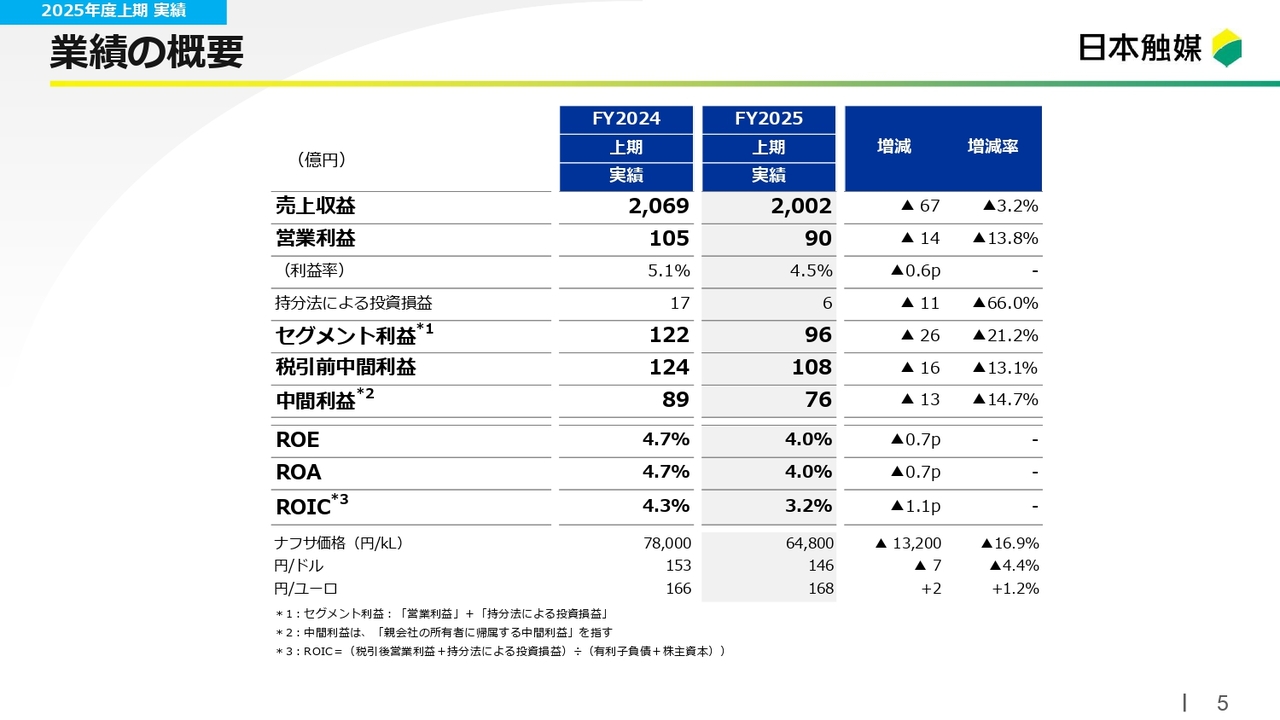 まず、上期の実績についてご説明します。売上収益は2,002億円で対前年67億円の減収、営業利益は90億円で対前年14億円の減益です。また、セグメント利益は96億円で、対前年26億円の減益となりました。