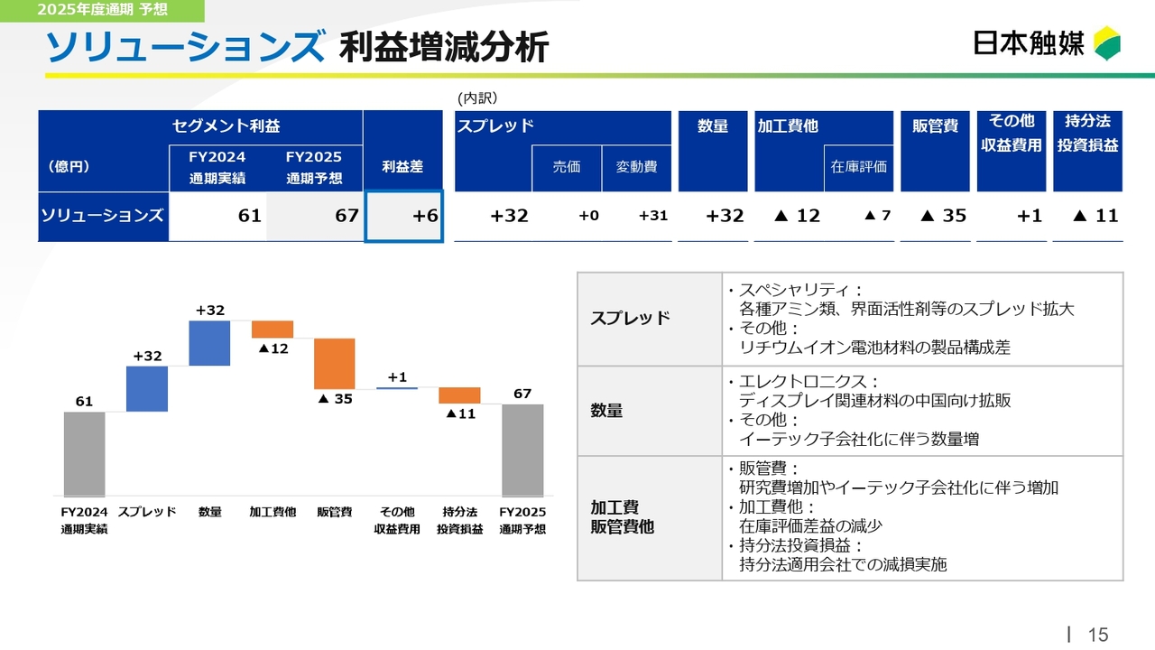 セグメント別に見ていくと、マテリアルズ事業では対前年で37億円の減益を予想しています。数量はSAPを中心に増加しますが、特殊エステルやAESといった海外事業の低迷によりスプレッドが縮小します。
