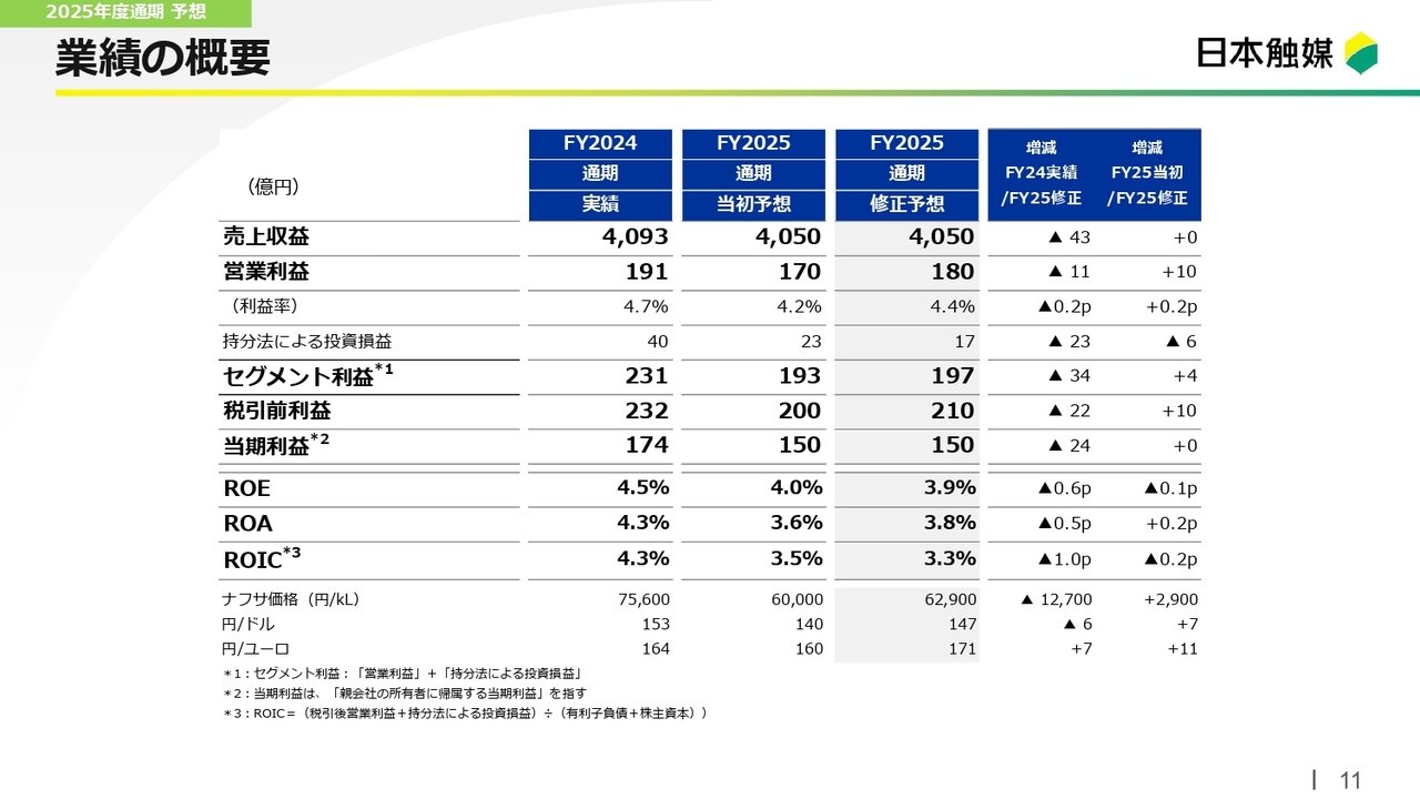 次に、2025年度通期の予想です。売上収益は4,050億円、営業利益は180億円、当期利益は150億円としています。5月に発表した数字から、営業利益と税引前利益をそれぞれ10億円上方修正しました。