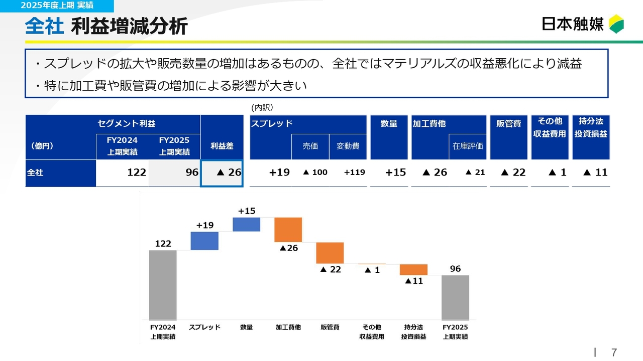 スプレッドの拡大や販売数量の増加があった一方、マテリアルズ事業、特にエステル類の収益悪化の影響が大きく、全体では減益となりました。この中でも、在庫評価を含む加工費や販管費が増加しています。