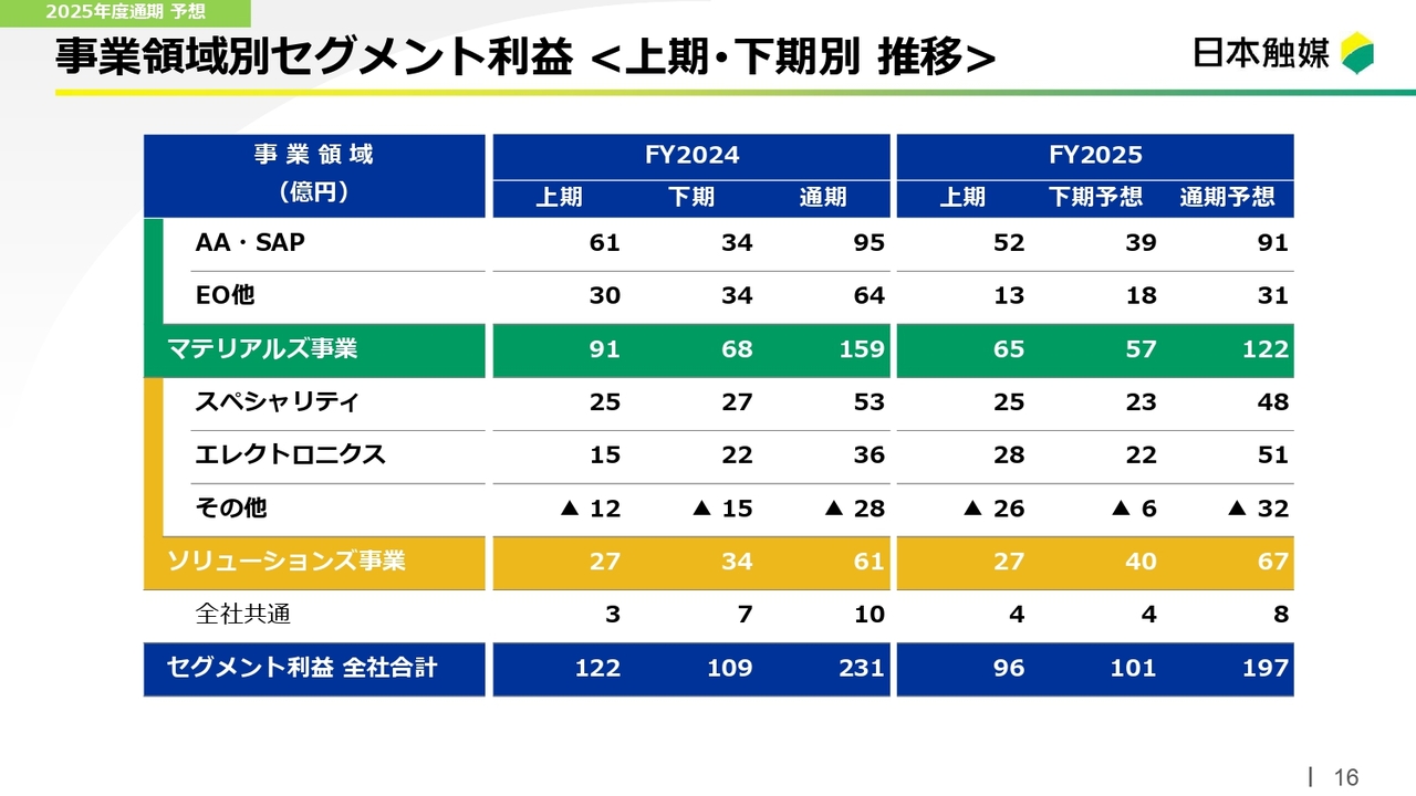 質問者:マテリアルズについて質問です。16ページではAAとSAPが上期・下期で13億円程度の減益を予想されています。こちらは、シンガポールでの定修等が要因でしょうか? 上期にも定修があったかと思いますが、なにか特殊な要因があると考えているのでしょうか?