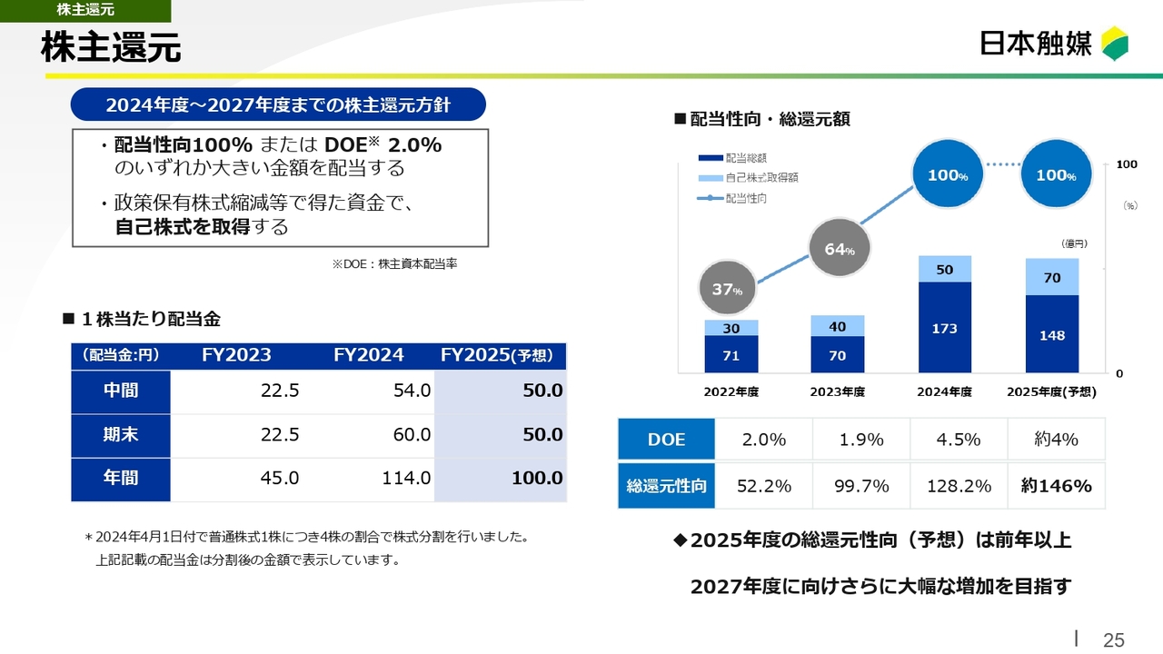 この方針に基づき、2025年度の中間配当は1株当たり50円、年間では1株当たり100円を予定しています。