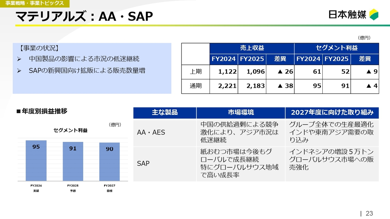 マテリアルズ事業のAA(アクリル酸)およびSAPの状況についてです。中国製品の影響による市況の低迷は今後も続くと見ている中、SAPについては新興国向けの拡販が進み、数量が増加しています。