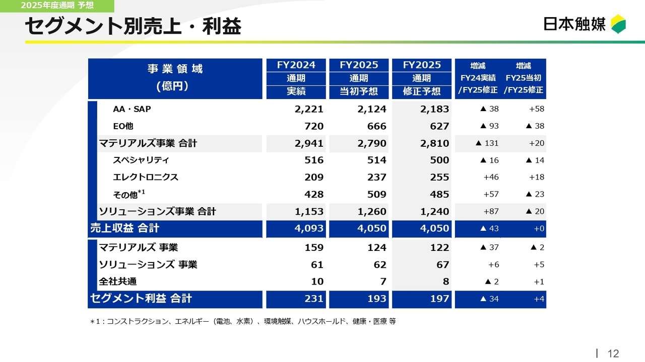 また、セグメント利益については、マテリアルズ事業が122億円、対前年で37億円の減益としています。ソリューションズ事業が67億円、対前年で6億円の増益を見込んでいます。ソリューションズ事業は減損がありましたが、エレクトロニクスを中心に利益が伸びてきています。