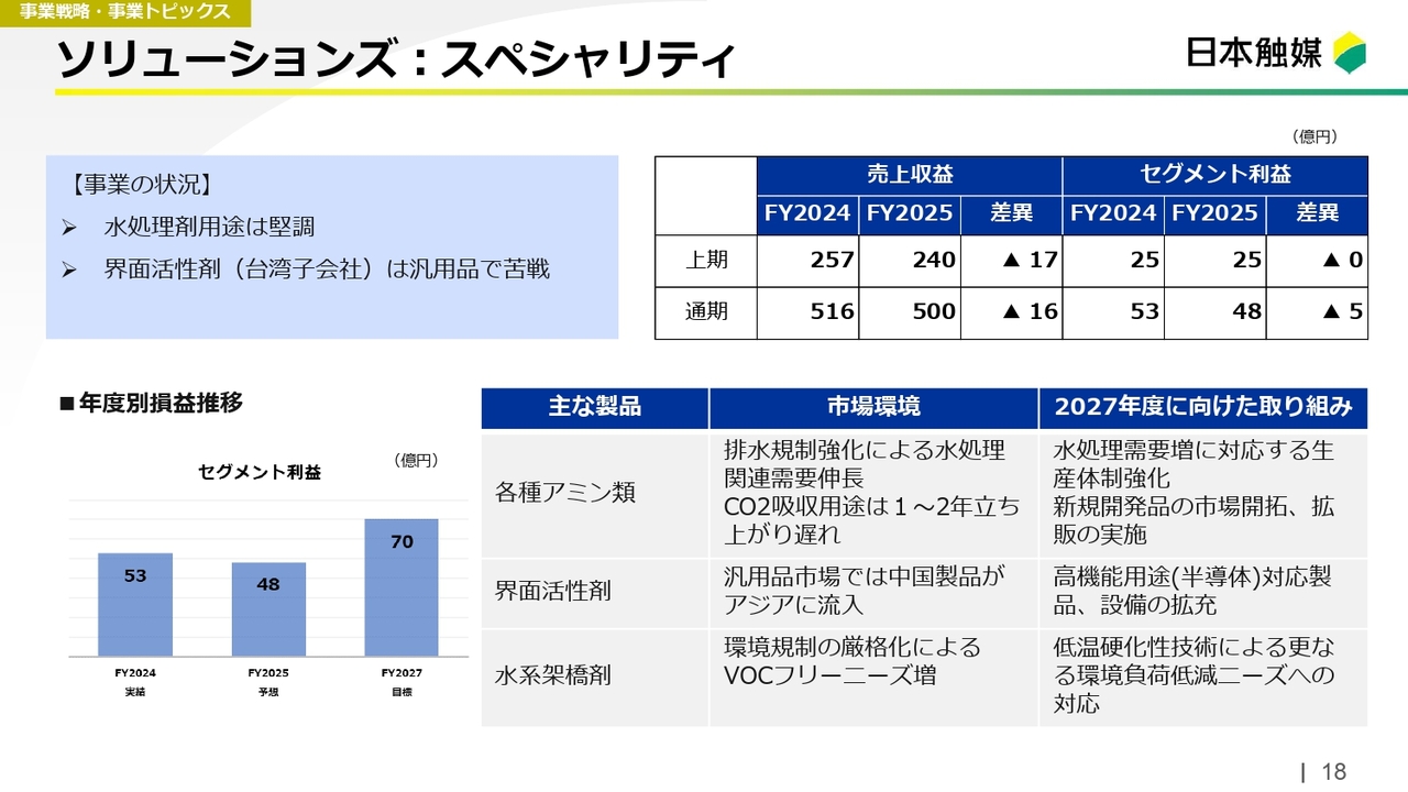 状況としては水処理剤用途が堅調に推移している一方、台湾子会社の界面活性剤が汎用品で苦戦しており、その影響が数字に表れています。