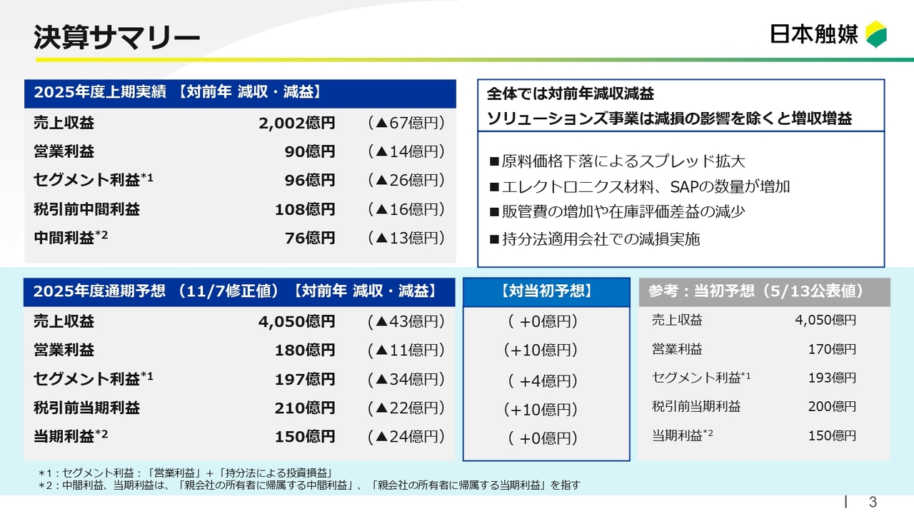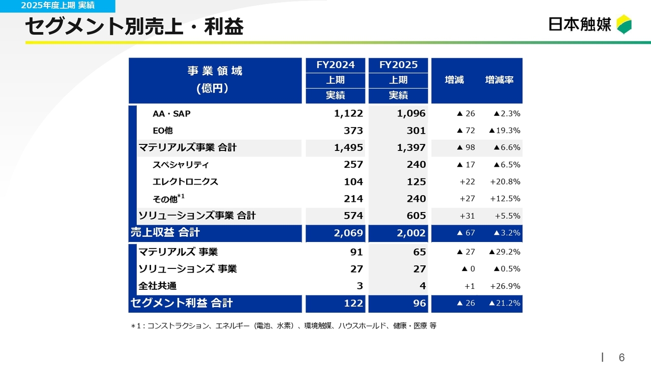 一方で販管費の増加や在庫評価差益の減少、持分法適用会社での減損といったマイナス要因があり、全体としては対前年で減益となりました。なお、今回からセグメント利益という表現で営業利益に持分法損益を加えたものを示しています。