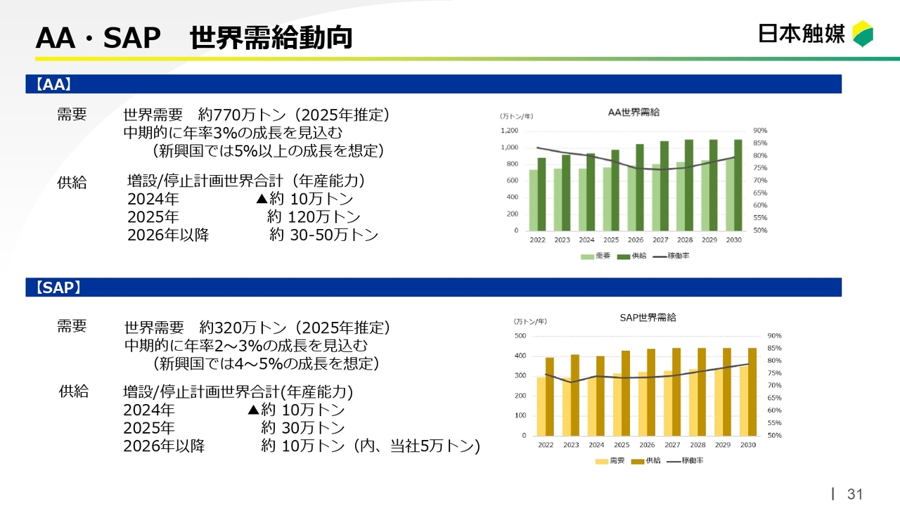 質問者:31ページにあるAAとSAPの需給バランスについては、大きなアップデートはないと思います。ただし、AAについては需要の見通しが前回よりやや下がるように見え、2025年度以降の稼働率が少し低下する可能性があると見ています。