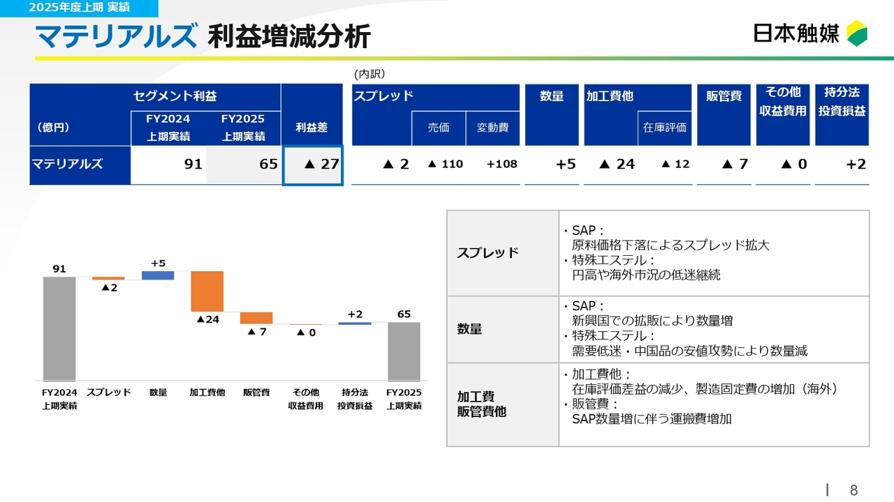 セグメント別に見ると、マテリアルズ事業の利益増減分析では、対前年で27億円の減益となりました。スプレッドはSAPで拡大したものの、特殊エステルなどで海外市況の低迷によるマイナスがありました。