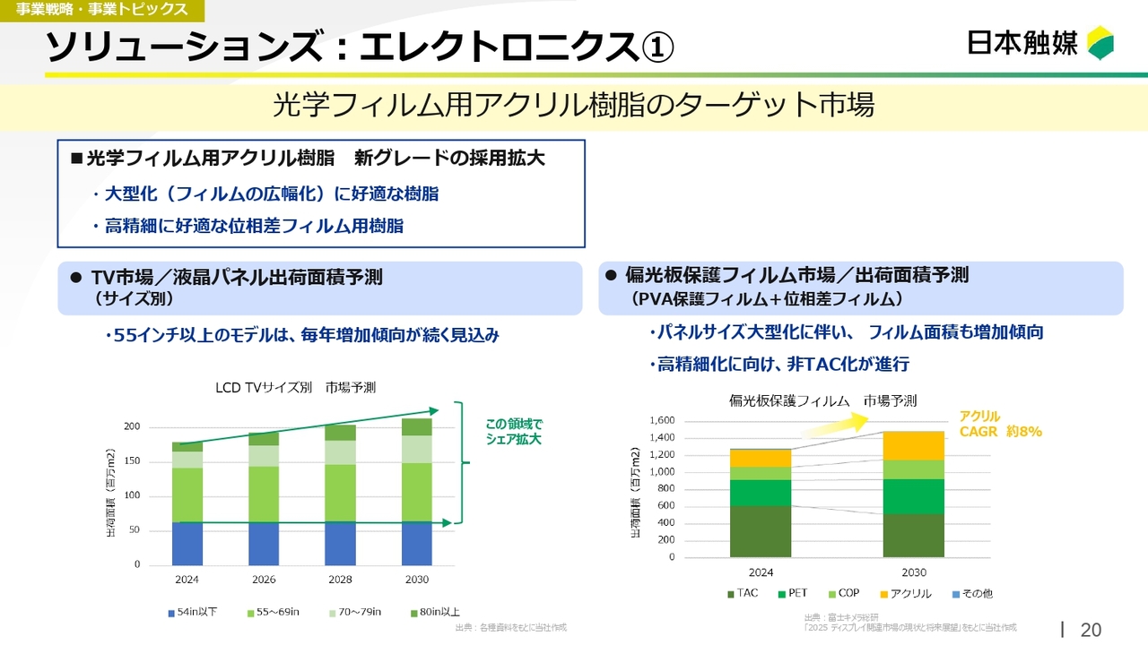 野田:エレクトロニクスについては、20ページになります。実際にはPETからアクリルへの切り替えというよりも、アクリル主体のフィルムを扱っているお客さまの中で、当社の製品を採用するお客さまが増えてきているという状況です。