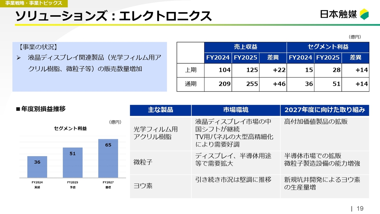 エレクトロニクス事業の状況についてです。液晶ディスプレイ関連では、光学フィルム用アクリル樹脂「アクリビュア」や微粒子などの販売量が増加しています。
