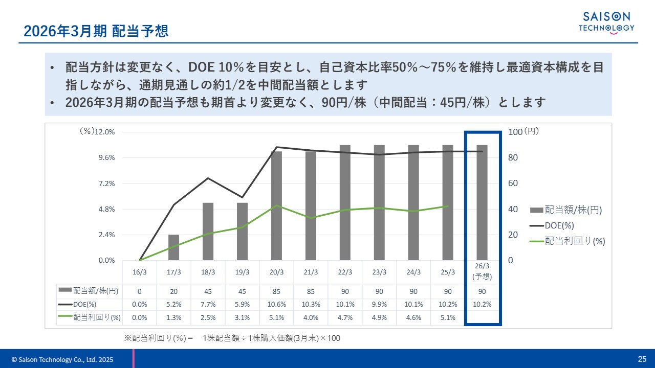 配当予想にも変更はありません。配当方針に基づき、中間配当は45円、期末配当は45円、合計90円を予定しています。