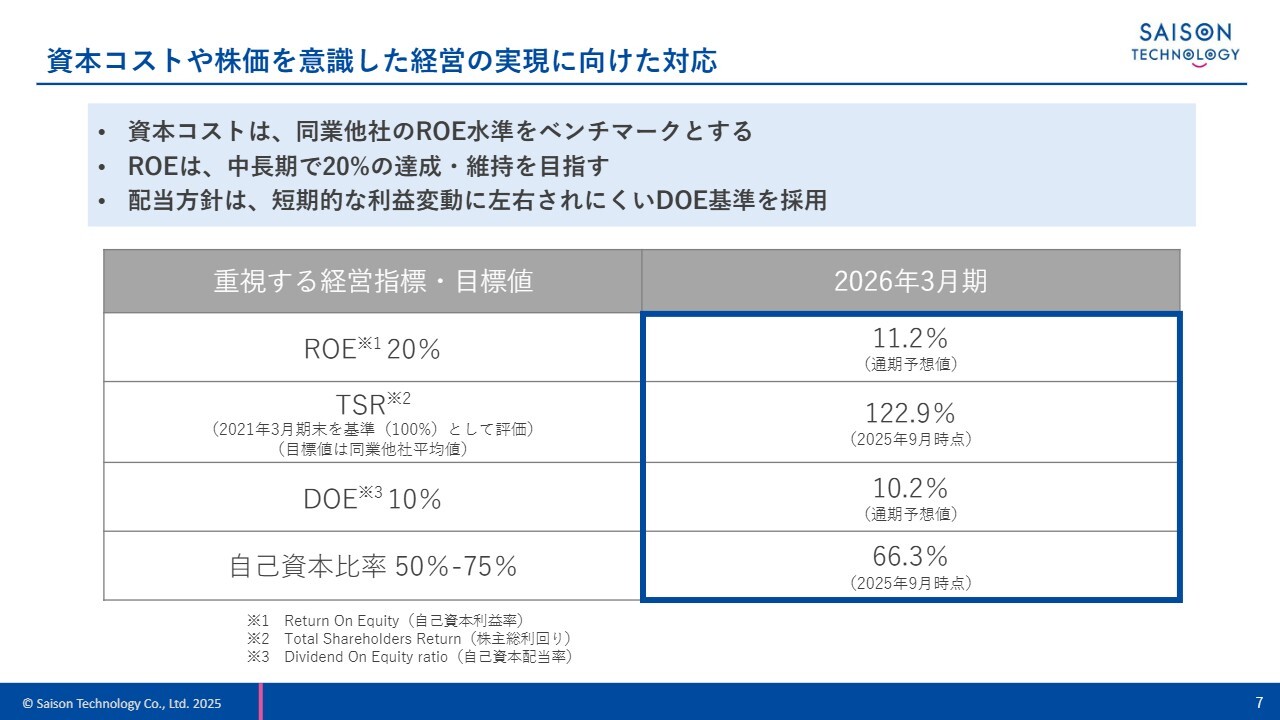 当社の株主資本コストはCAPMに基づく試算で約3パーセントとなりますが、同業他社のROE水準をベンチマークに、中長期的にはROE20パーセントを目指しています。