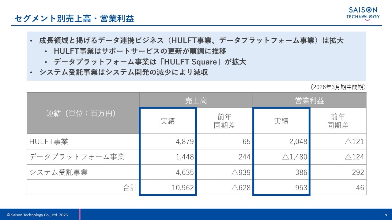 売上高は、主にシステム開発案件の減少などにより減収となりました。一方、当社が成長領域として掲げているHULFT事業およびデータプラットフォーム事業は堅調に拡大しています。