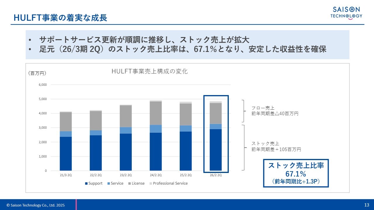 サポートサービスを中心としたストック売上比率は、足元の2026年3月期中間期において67.1パーセントとなり、引き続き高い水準で推移しています。