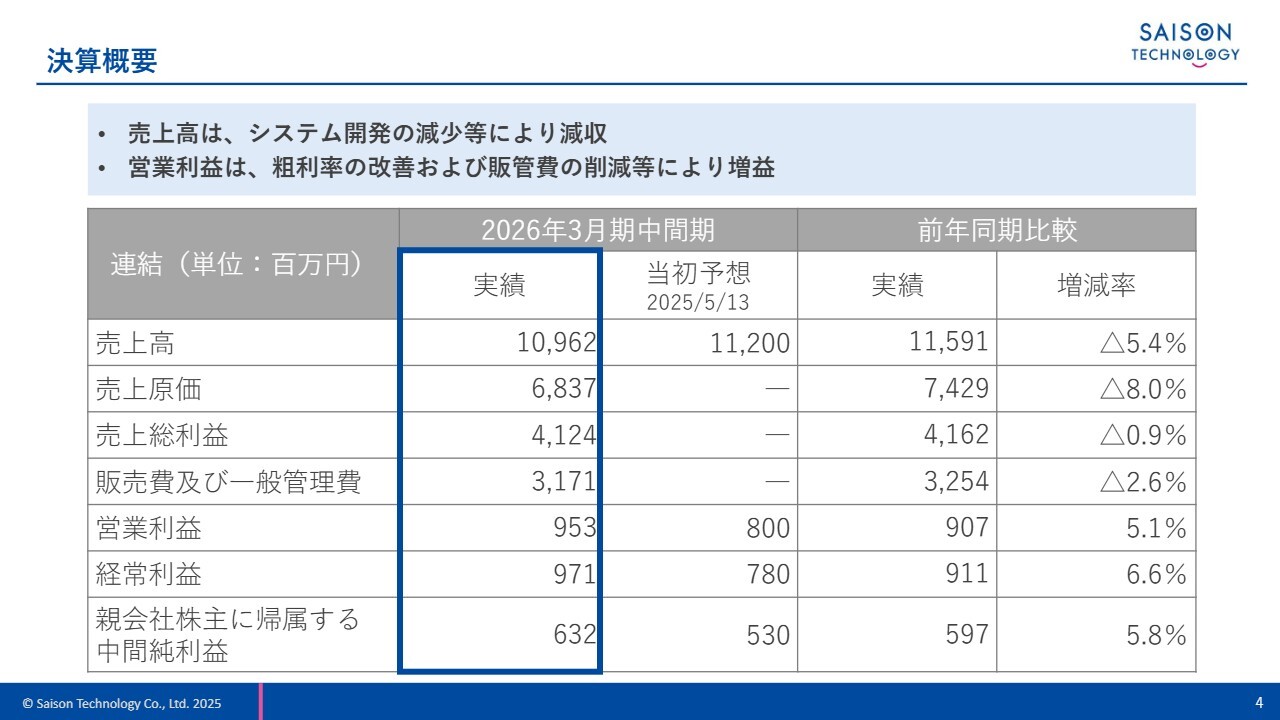 2026年3月期中間期の決算ハイライトをご説明します。当社連結グループの2026年3月期中間決算は減収増益となりました。