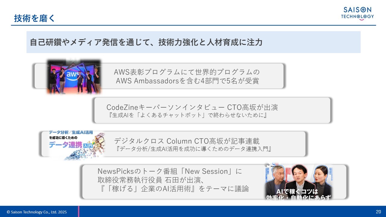 例えば「Amazon Web Services」、いわゆるAWSの専門知識や活動実績が評価され、AWS表彰プログラムの4部門で当社のエンジニア5名が受賞しました。