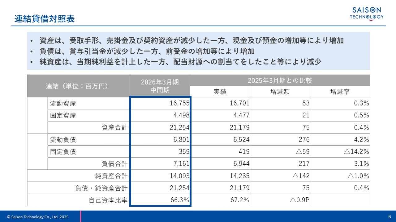 これらの結果により、自己資本比率は0.9ポイント減少して66.3パーセントとなりました。