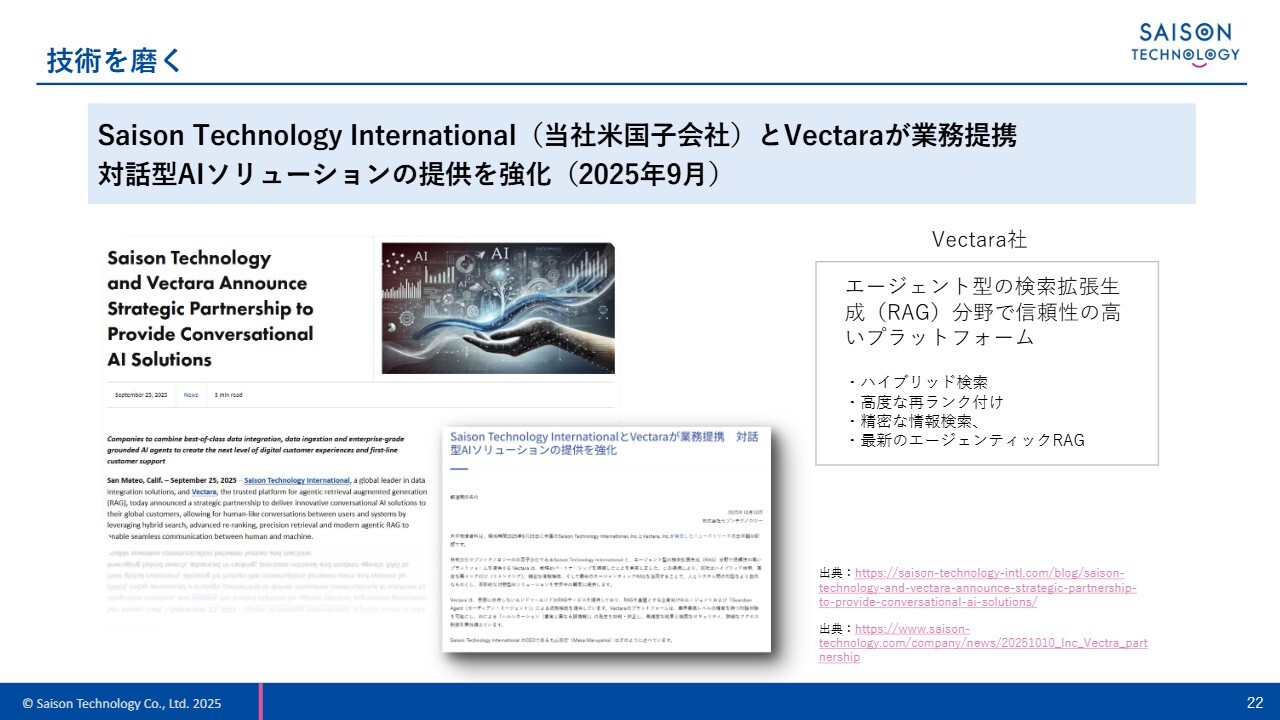 その流れから、当社の米国法人であるSaison Technology Internationalは、エージェント型RAGの分野で信頼性の高いプラットフォームを提供するVectaraさまとの業務提携を発表しました。