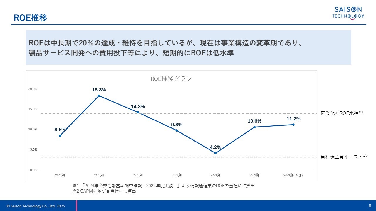 前のスライドでご説明したとおり、当社は自社製品・サービスを提供する高収益のIT企業として、中長期的にはROE20パーセントを目指しています。