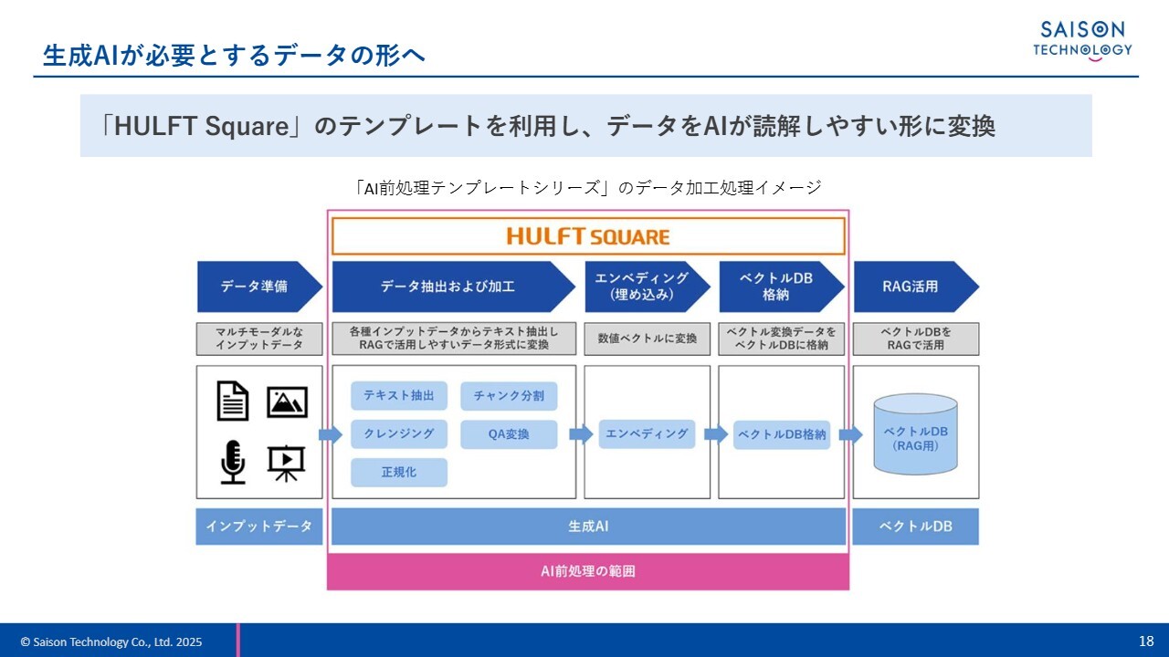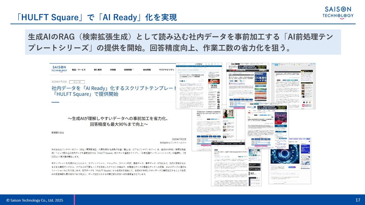 当社は、このテンプレートシリーズとして「AI前処理テンプレートシリーズ」の提供を開始しました。これは生成AIのRAGとして読み込む社内データを事前加工するもので、発表後、多くのメディアに取り上げられたことから、この領域への注目度の高さがうかがえました。