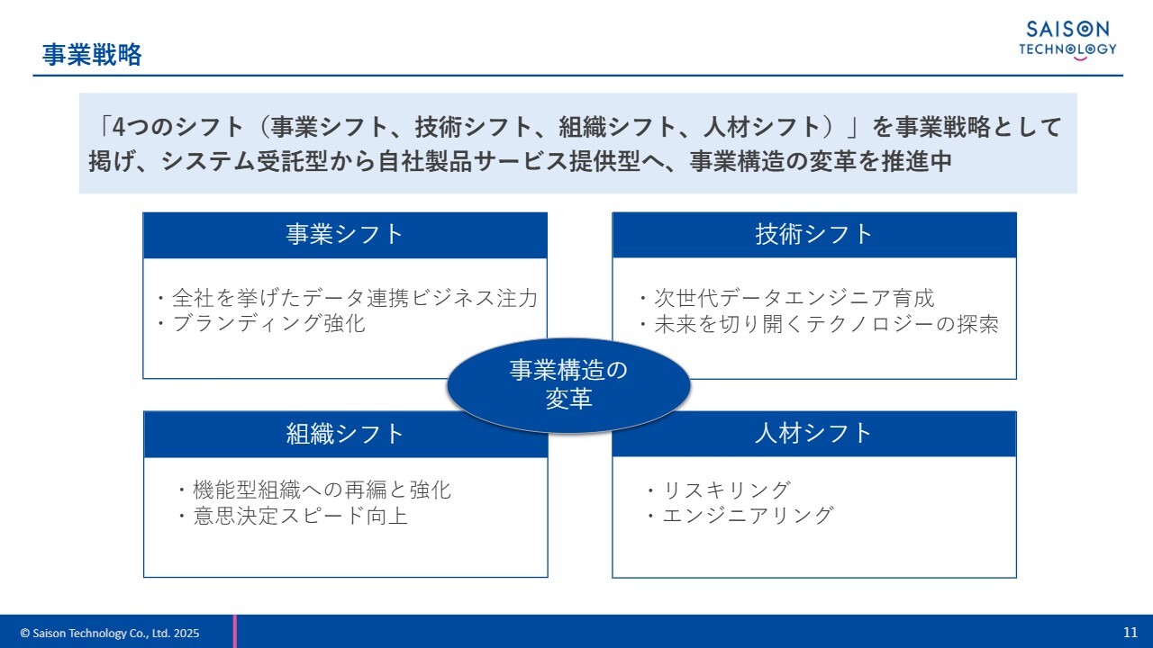 当期戦略とその取り組み状況についてご説明します。スライドには事業戦略として掲げている4つのシフトを記載しています。事業、技術、組織、人材の4つのシフトを通じて、システム受託型から自社製品サービス提供型へと事業構造の変革を進めています。