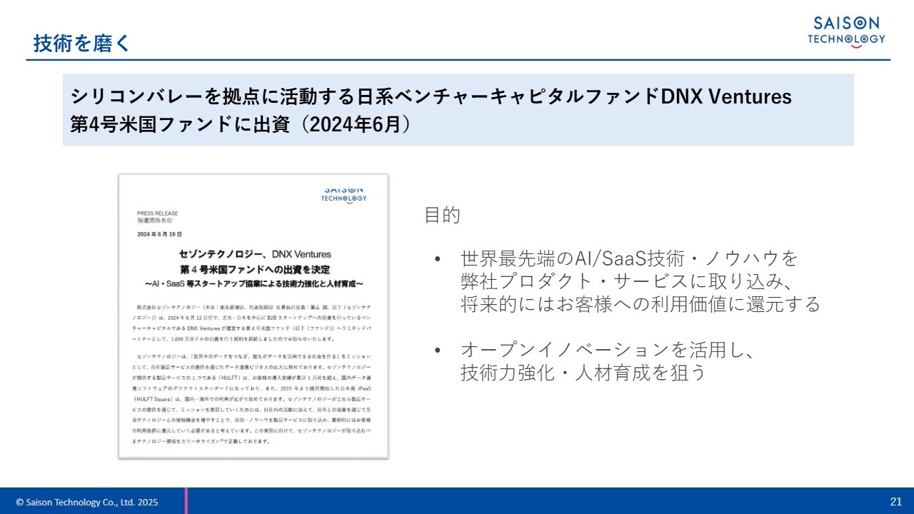 当社は昨年6月にDNX Venturesへの出資について発表しました。AIやSaaSの技術を北米からリサーチし、当社の製品やサービスに積極的に取り込むことで、製品を通じてお客さまに還元していきます。