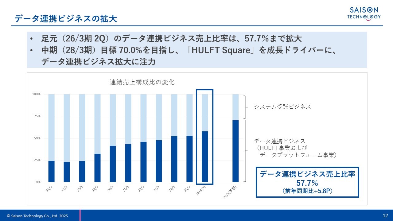 スライドのグラフに濃い青色で示した部分がその比率を示しています。2016年3月期には全社売上の4分の1程度でしたが、足元の2026年3月期中間期では57.7パーセントまで拡大しました。前期末比でも5.8ポイントの増加となっています。今後も当社はデータ連携ビジネスを拡大していきます。