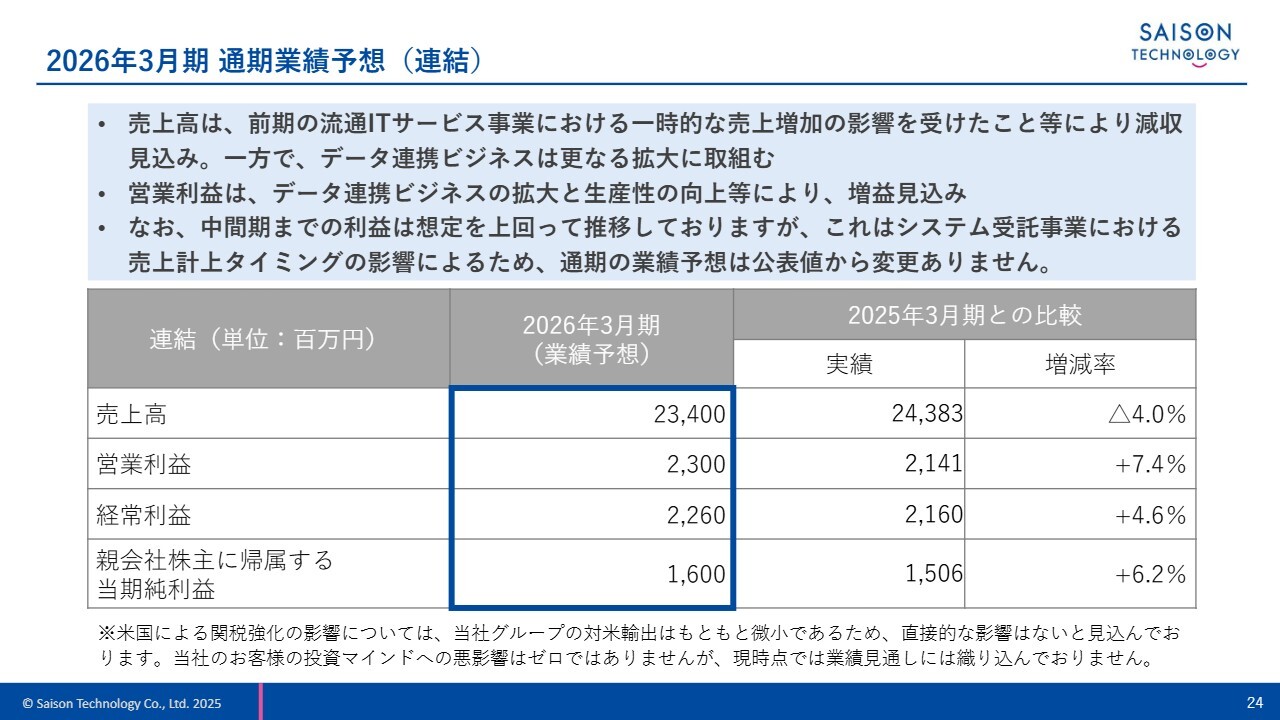 通期業績予想に変更はありません。2026年3月期中間期までの利益は想定を上回って推移していますが、これはシステム受託事業における売上計上のタイミングが影響したものであり、通期予想に変更はありません。