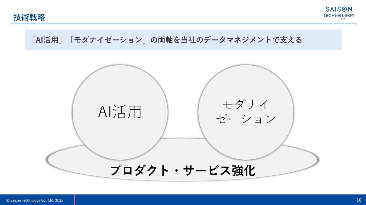 スライドに記載しているのは、今年6月の株主総会でCTOが発表した技術戦略のテーマです。AI活用とモダナイゼーションの両軸を、当社の強みであるデータマネジメントで支えていく方針に変更はありません。
