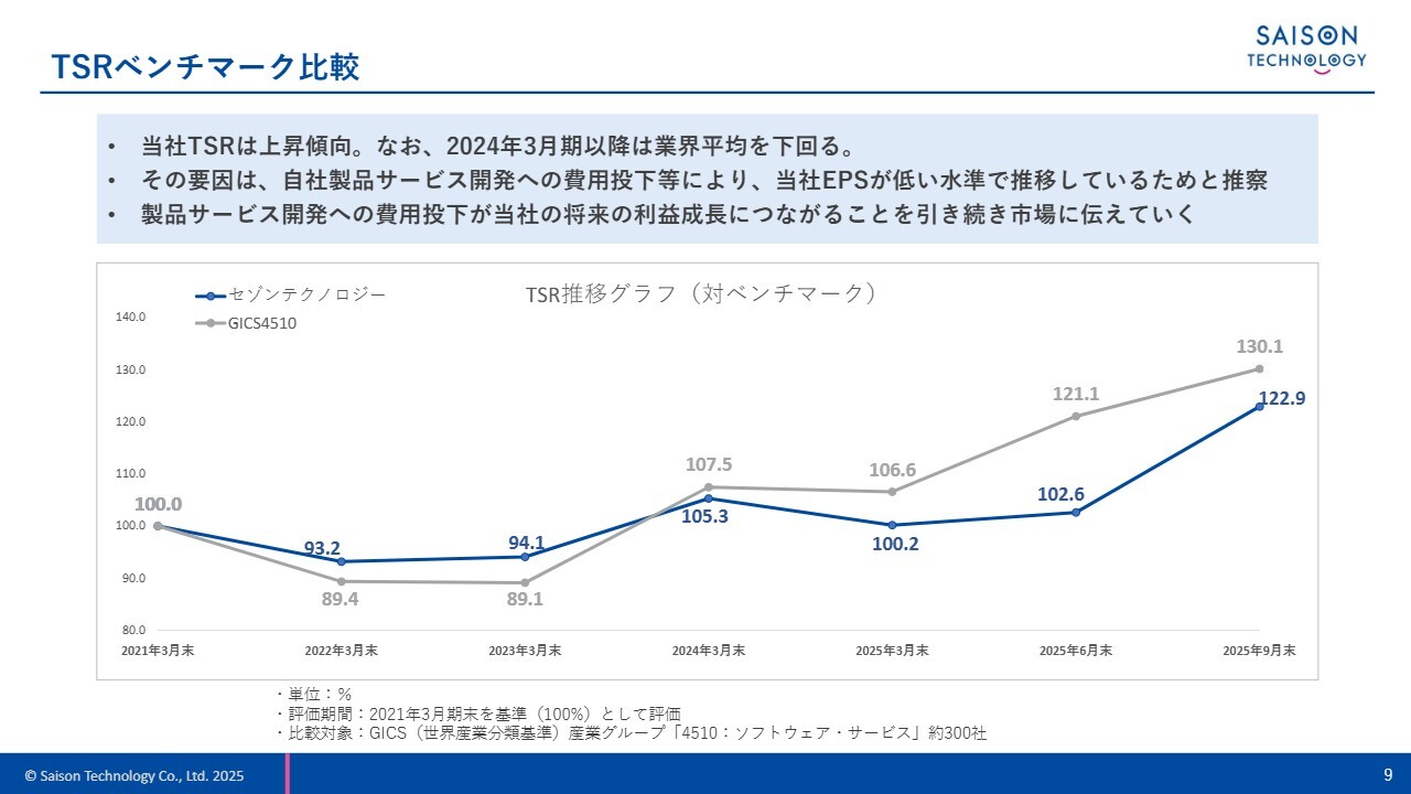 TSRのベンチマーク比較です。評価期間は2021年3月期末を基準としており、比較対象はGICS産業グループ約300社です。ご覧のとおり、当社のTSRは業界平均を下回って推移しています。