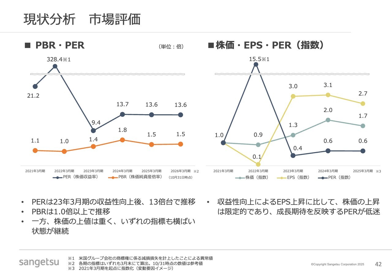 当社の市場評価に対する認識についてお話しします。PBRについて、当社では成長投資と株主還元の適切なバランスを重視し、増配および自己株式取得を継続的に実施してきました。その結果、2023年3月期の収益性向上を背景に、PBRは現在1倍以上で推移しています。
