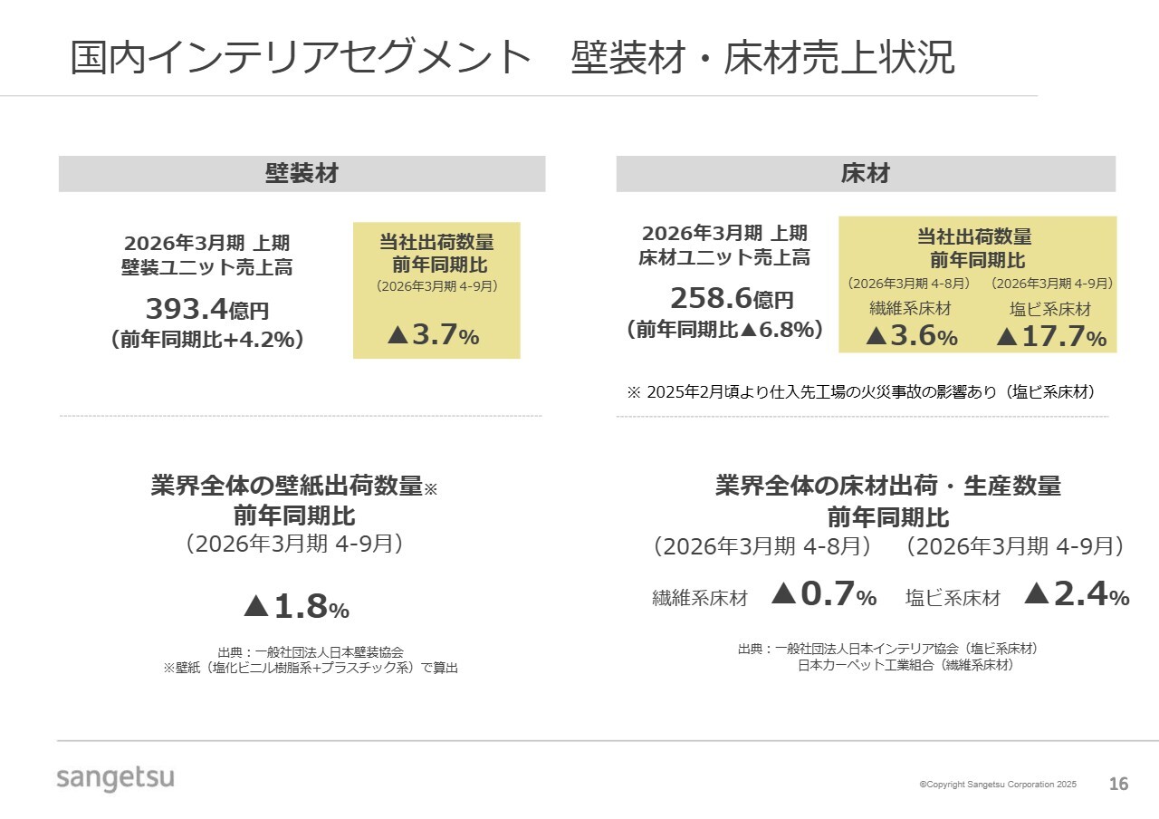 我々の主力商品である壁装材と床材の売上状況についてです。壁装材は前年同期比で4.2パーセント増加しました。一方、床材は6.8パーセント減少しています。
