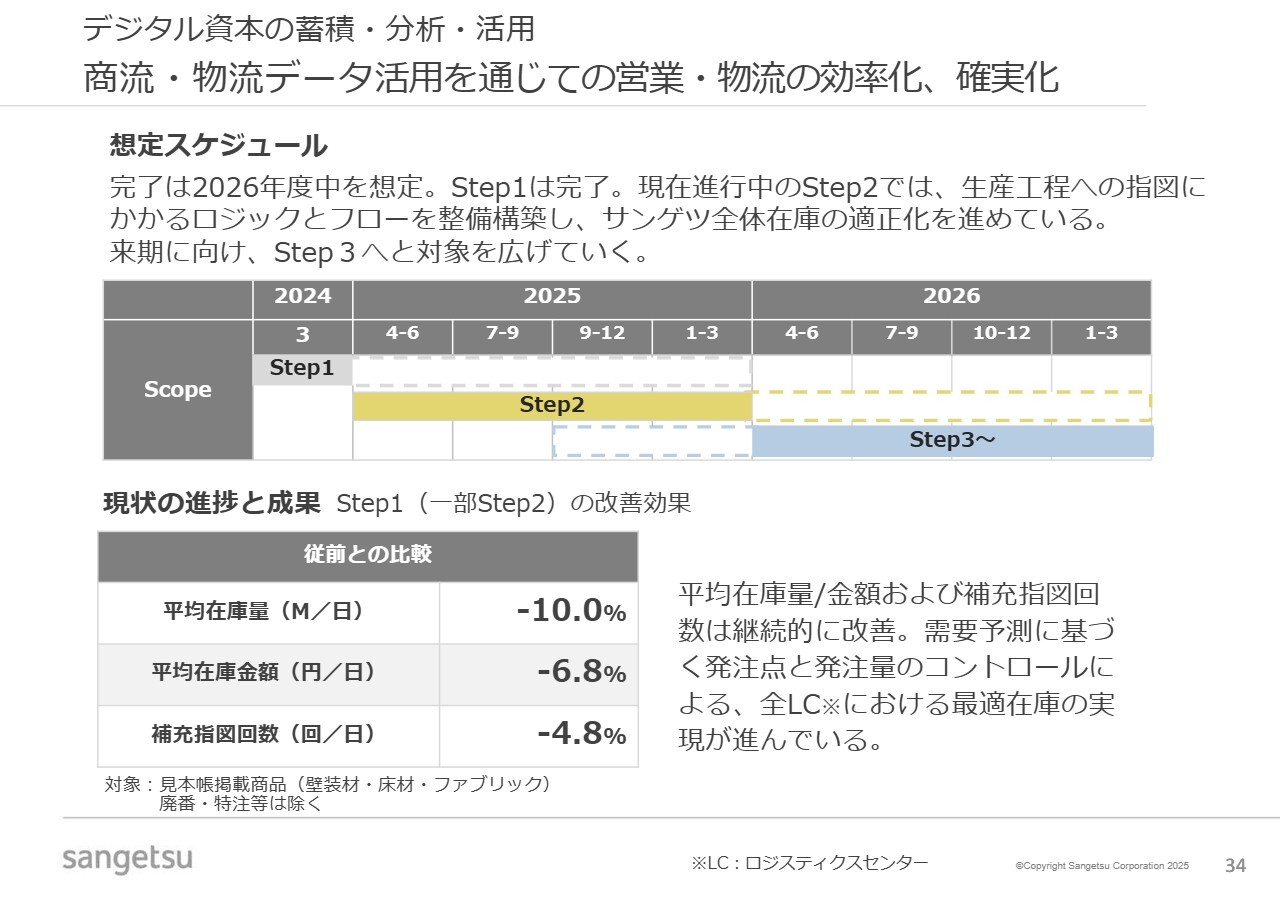 サプライチェーンの見直しと強靭化については、スライドに示したタイムスケジュールを組んで進めており、ほぼ計画どおりに進んでいます。また、スライド下段に示しているとおり、着実に実効を伴って進捗しています。