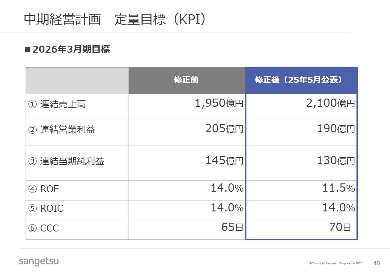 資本コストや株価を意識した経営の実現に向けて、各項目の現状分析と取り組み方針についてご説明します。中期経営計画の定量目標についてです。5月14日付けの適時開示で公表したとおり、一部の定量目標を見直しています。