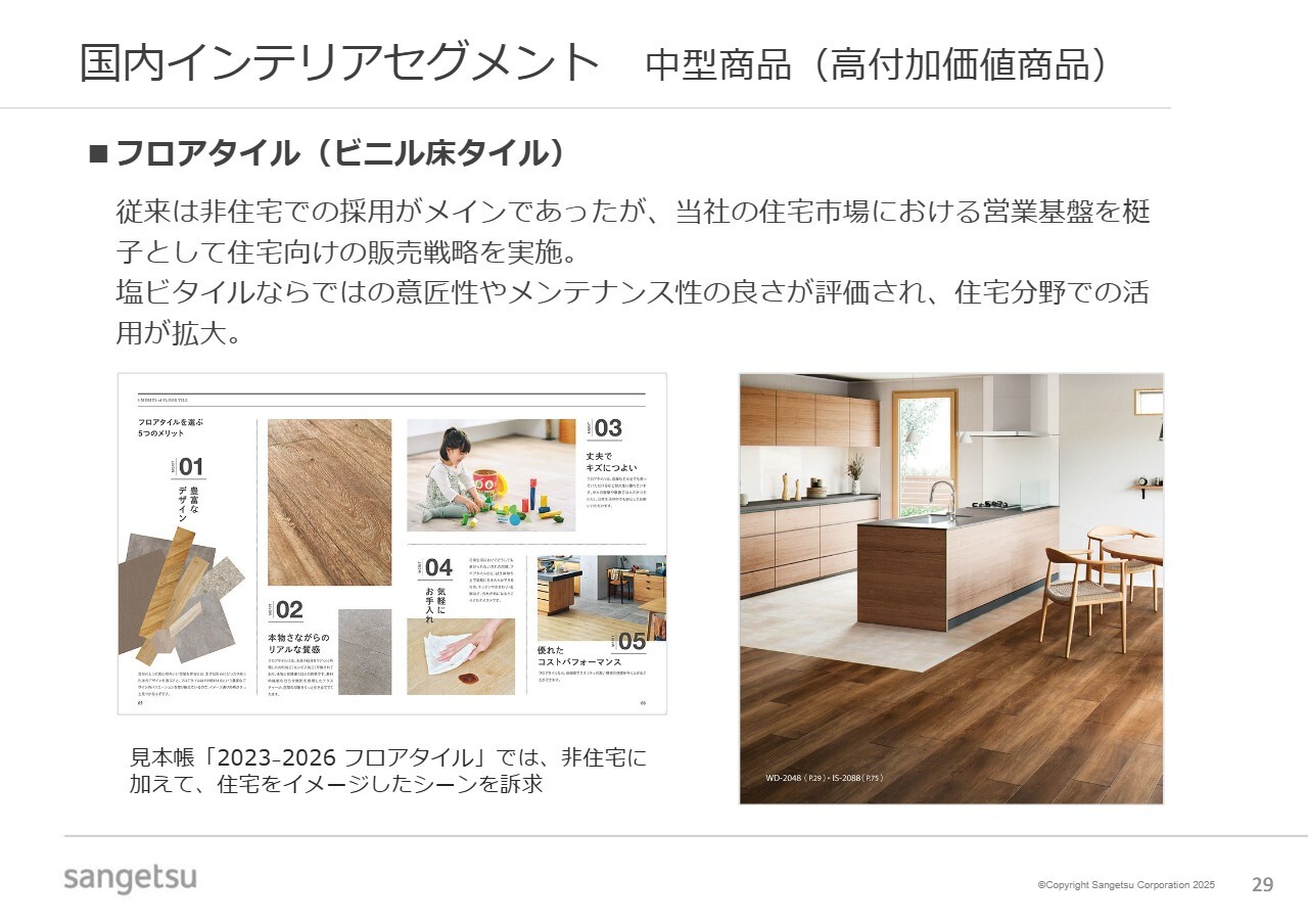 今お伝えした中型商品の一例として、スライドに記載されている「フロアタイル」が挙げられます。当初は非住宅向けを対象としていましたが、意匠性や施工性などの利点、さらにはコスト面における強みから、住宅向けでも採用が広がりつつある状況です。