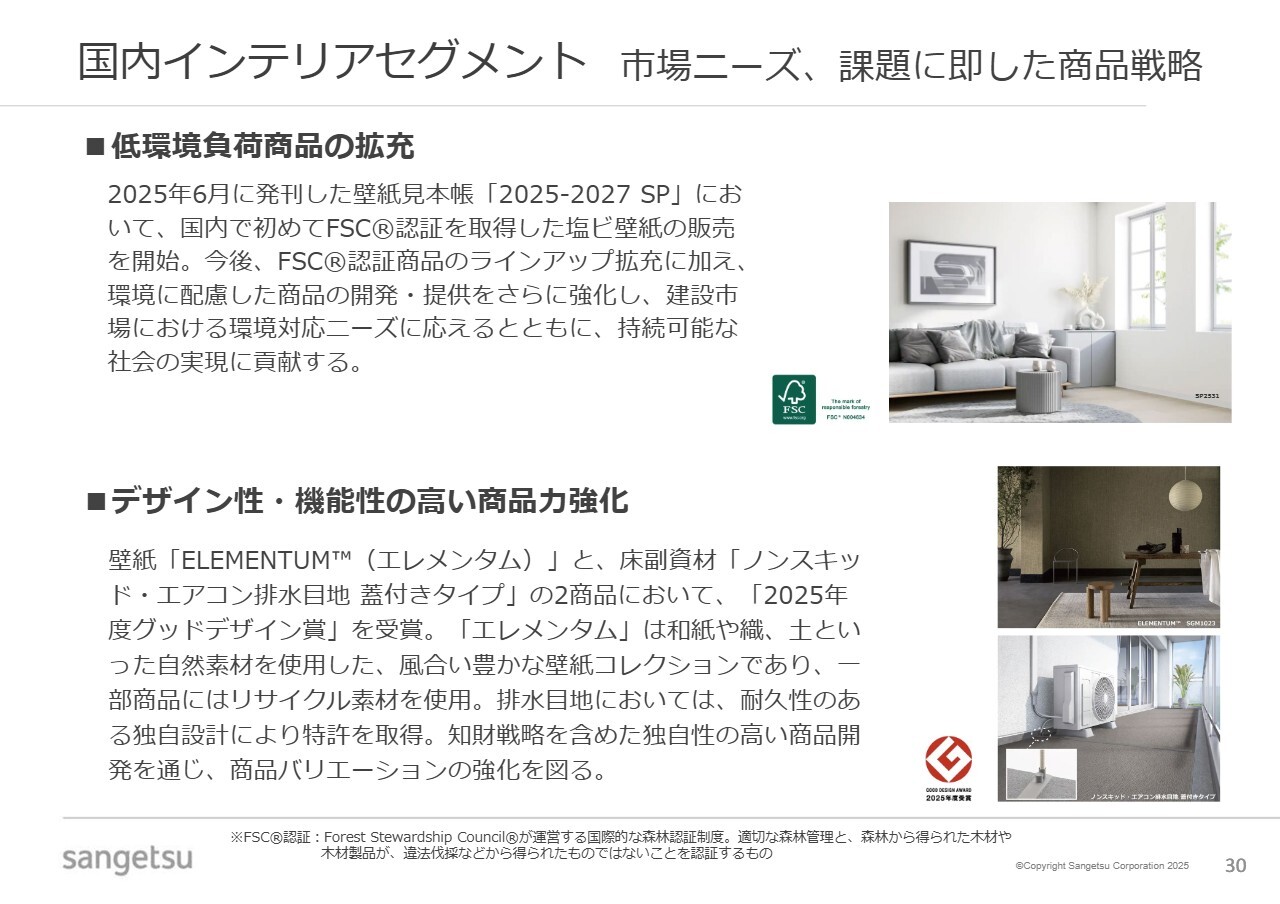 一方で、各商品の中でも、付加価値の高い繊維系の床材やフロアタイルについては、数量が伸びています。数量を重要なKPIの1つとして注視していますが、顧客ニーズや社会課題の解決に寄与する高付加価値商品の拡充を進めることで、商品ポートフォリオの強化を図っていきたいと考えています。