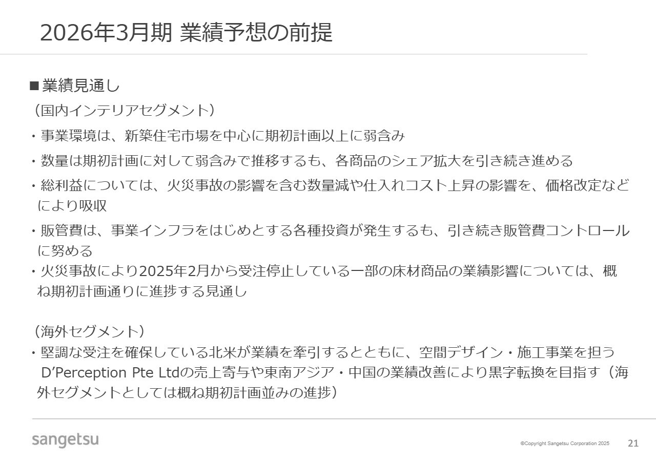 国内インテリアセグメントの事業環境については、新築住宅市場をはじめとして引き続き厳しい状況が続くと想定しています。市場全体の数量は弱含むと考えていますが、当社においては火災事故の影響が下期にかけて軽微になってくることもあり、各商品のシェア拡大に再度取り組む方針です。