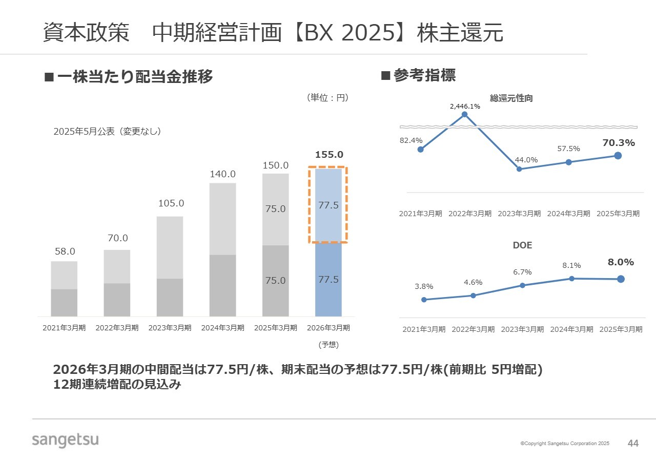 2026年3月期の配当金については、中間配当を1株当たり77.5円と決定し、期末配当も同額の77.5円を予想しています。これにより、前期比5円増配となる1株当たり年間配当金155円を見込んでいます。