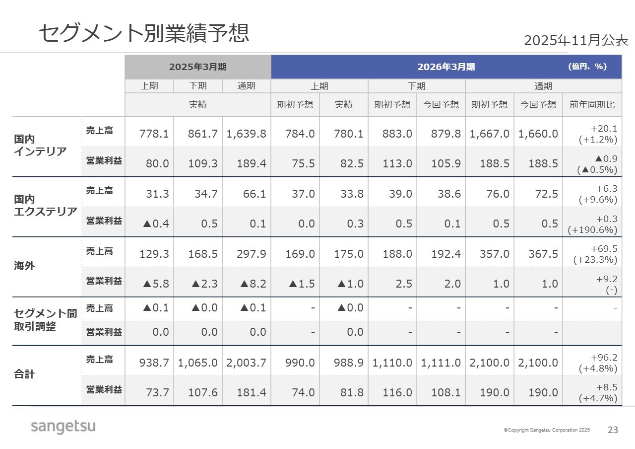 セグメント別業績予想についてです。上期の進捗や国内市場の需要の弱さを踏まえ、国内インテリアセグメントおよび国内エクステリアセグメントの売上高を見直しています。一方で、海外セグメントについては売上の伸長を反映しています。また、営業利益は3セグメントとも据え置きとしています。