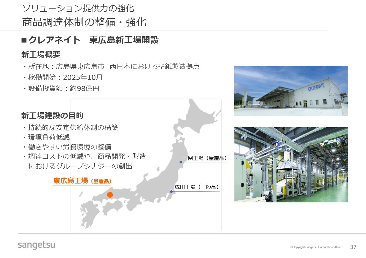 ご存じのとおり、一関工場は岩手県に位置しており、岩手県で製造した商品を西日本に運ぶ必要があるほか、西日本で生産された壁紙の原材料を岩手県に運ぶという状況もありました。そのため、西日本に工場を設立することで、経済合理性のほか、ESGの観点からも、原材料を西日本で引き取り、製品の出荷も西日本で行うという判断をし、東広島工場の設立を決定した経緯があります。