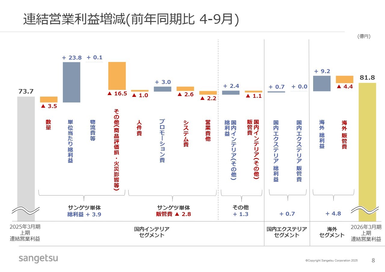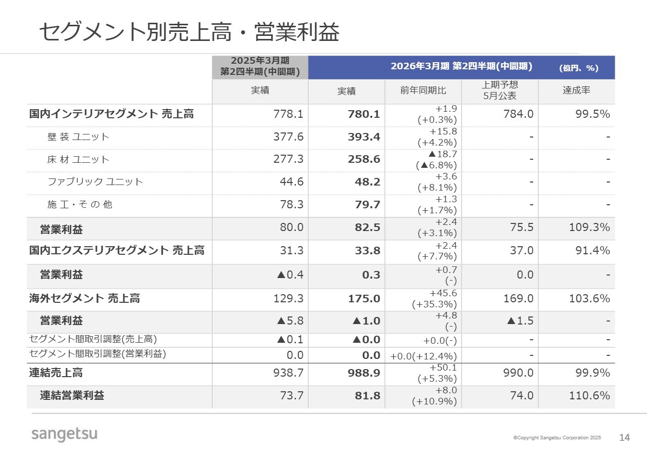 セグメントごとのポイントについてお話しします。主力の国内インテリアセグメントにおいて、営業利益は82億5,300万円で、前年同期比約3パーセントの増益となりました。