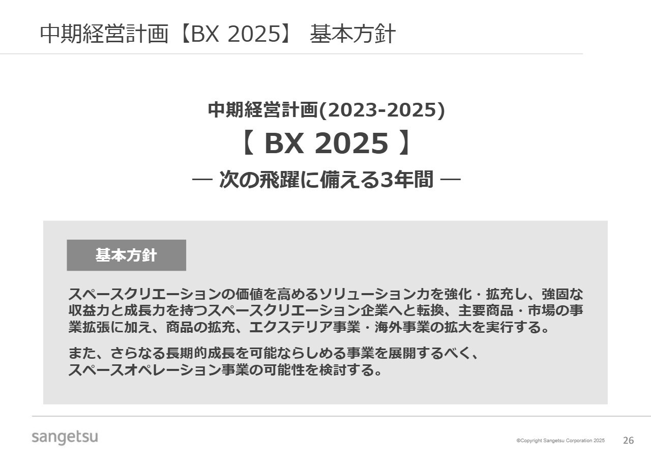 中期経営計画「BX2025」の基本方針についてです。今年度は、3ヶ年中期経営計画の最終年度に当たります。我々は、この3年間を次の飛躍に備える期間と位置付け、人的資本の拡充や、エクステリア、空間総合事業の強化を目指した組織改編を進めてきました。