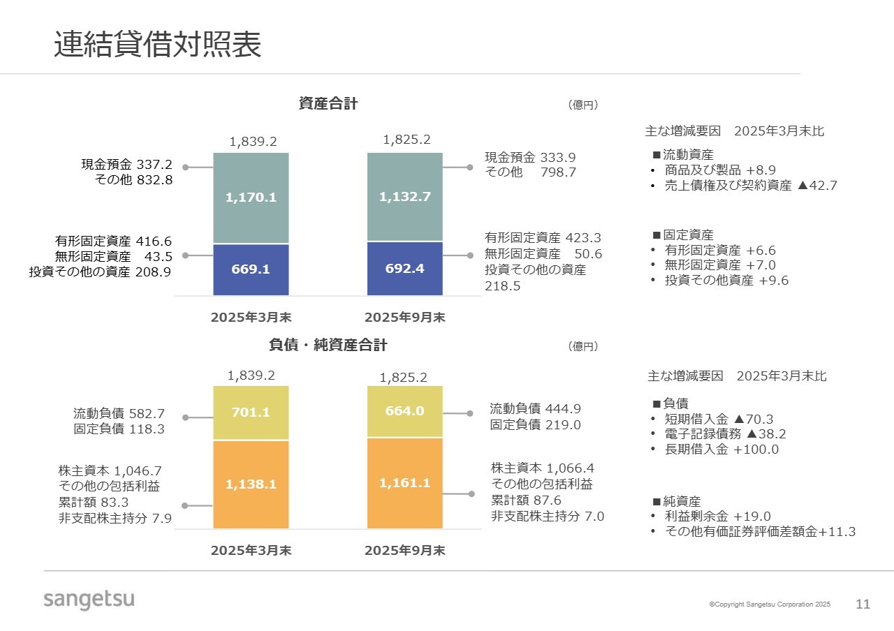 連結貸借対照表についてです。資産の部では、壁紙メーカーであるクレアネイトの東広島事業所に関わる設備投資や物流会社SDS社の株式取得といった成長投資により、有形および無形固定資産が増加しています。
