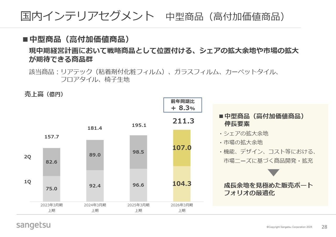 対象商品は、「リアテック」や「ガラスフィルム」といったフィルム商品、「カーペットタイル」「フロアタイル」といった床材、そして「椅子生地」です。今年度の売上高は211億円強で、前年同期比8.3パーセント増と高い成長を示しており、セグメント全体の売上高の4分の1に達しました。