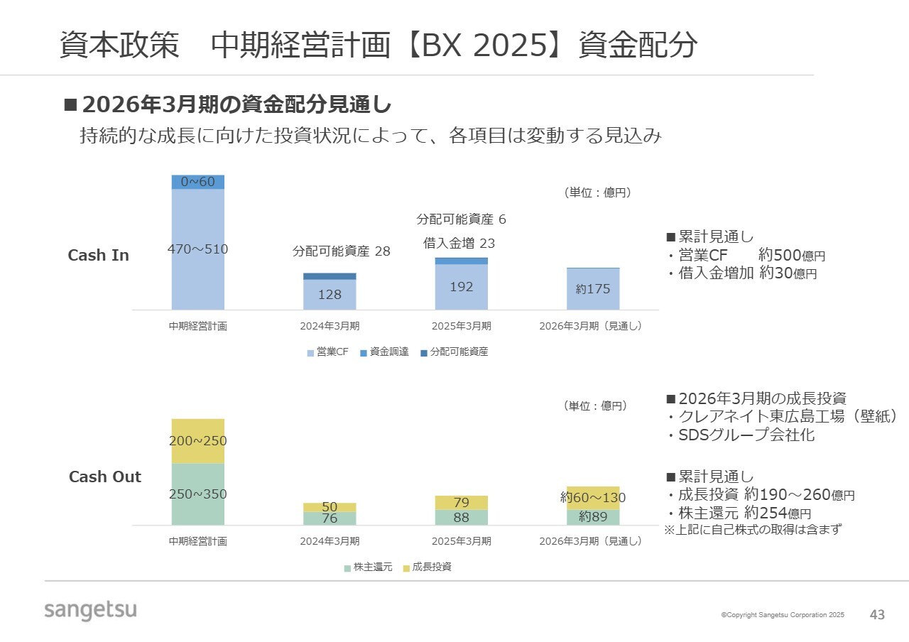 Cash Outについては、クレアネイト東広島事業所への設備投資やSDSの株式取得に加え、M&Aをはじめとする非連続的な成長投資を引き続き計画しています。