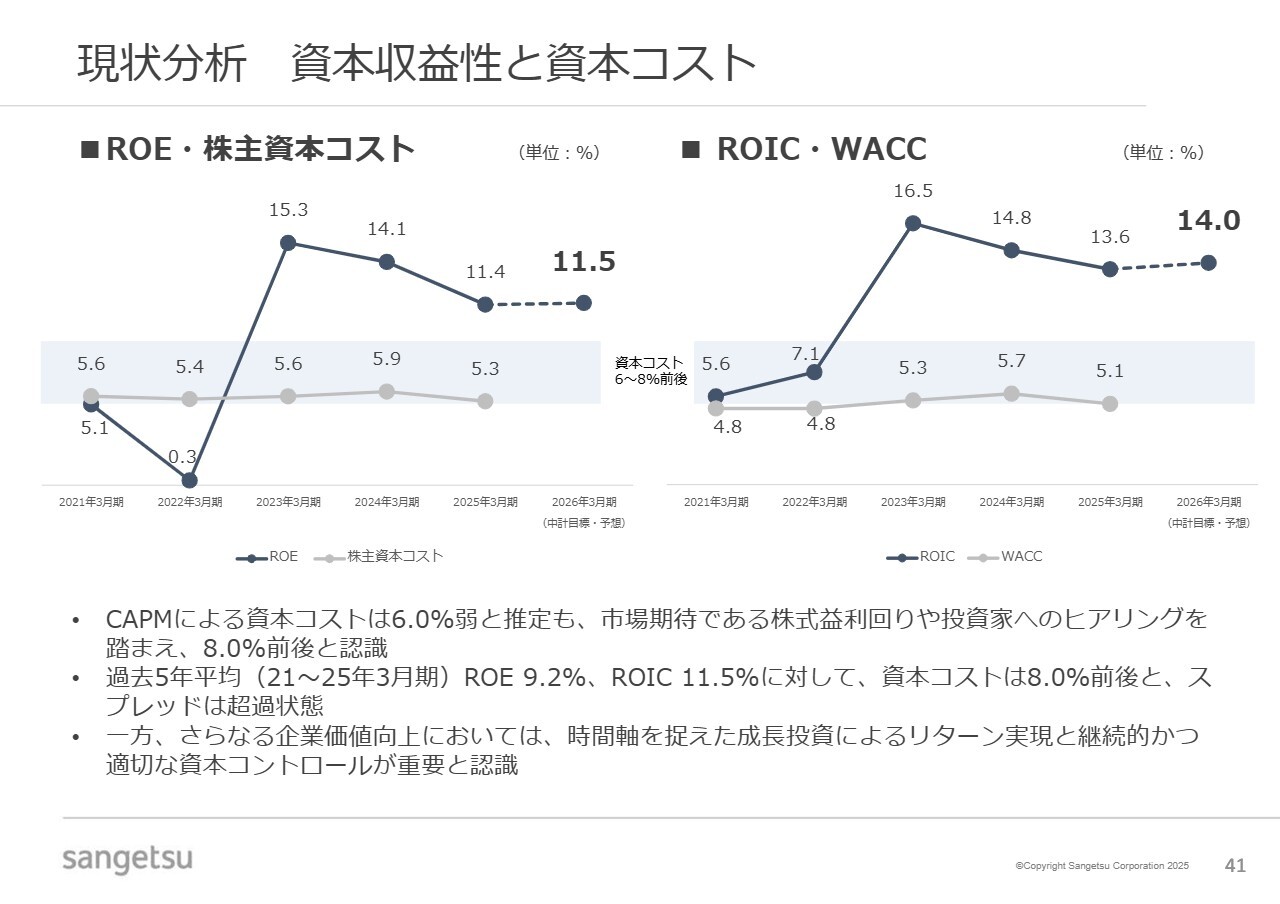 資本収益性と資本コストについてご説明します。資本コストについては、スライドに記載のとおり、株式益利回りや投資家のヒアリングなどを踏まえて8パーセント前後と認識しています。