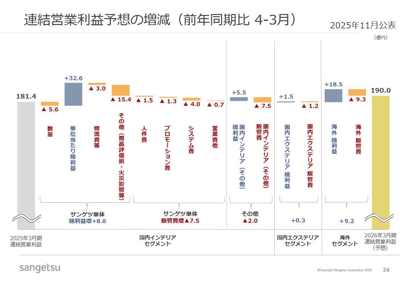 スライドのウォーターフォールチャートを用いて、営業利益予想の増減についてご説明します。サンゲツ単体では、価格改定による効果や販売ポートフォリオの改善が寄与し、数量減およびコスト増加をカバーする計画としています。