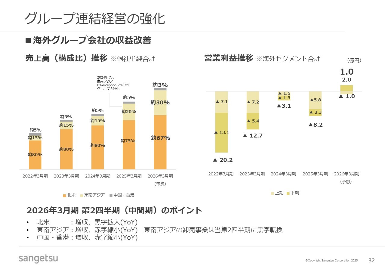 スライドにあるように、売上比率は3分の1弱、営業利益における比率も10パーセントを超えるレベルに達しており、次の中期経営計画以降、連結経営の重要性はさらに高まると感じています。単体と連結の良いバランスがようやく形成されつつあると実感しています。
