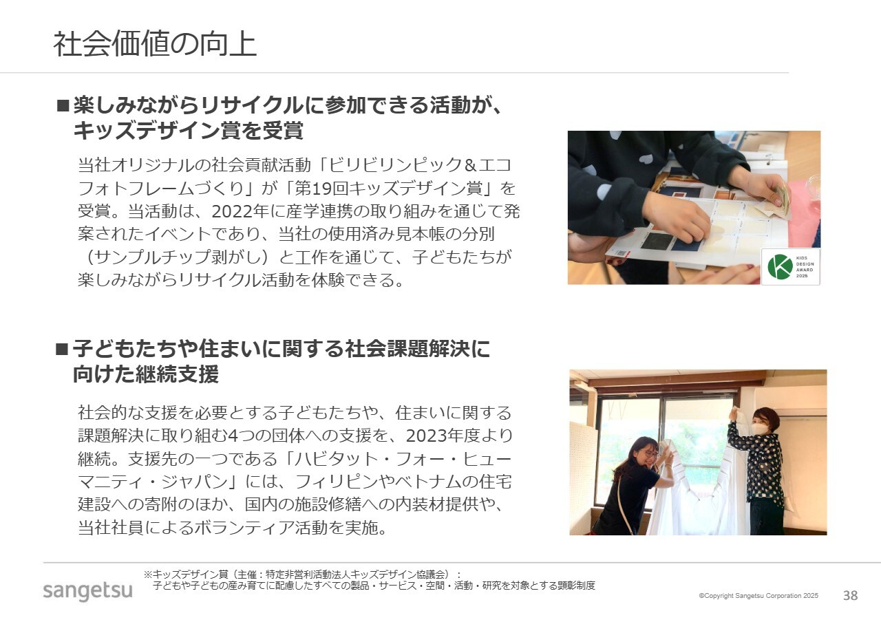 社会価値の向上に関わる社会貢献活動について、2点ご紹介します。1点目は、当社オリジナルの社会貢献活動が外部評価を受けた事例です。2点目は、子どもたちや住まいに関する社会課題解決に向けた継続支援の取り組みです。