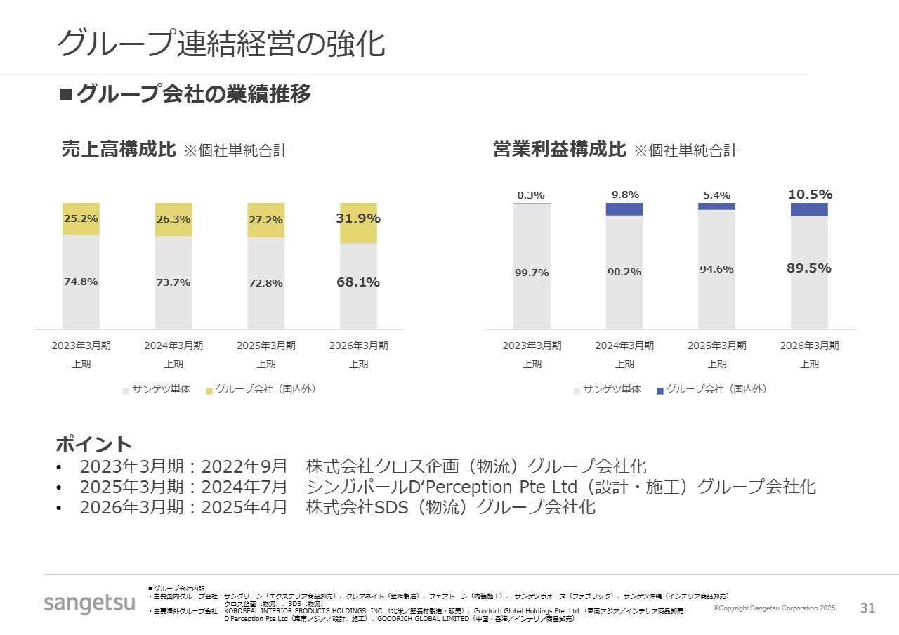 サンゲツグループの連結経営の強化についてです。冒頭にお伝えしたとおり、今年度上半期の結果を振り返ると、グループ会社の重要性が売上や利益の面で高まってきています。